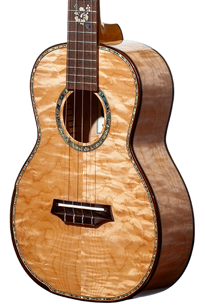 In 2018, Ohana introduced the CK-450QEL made in all solid quilted eucalyptus. This limited edition model features a number of specialty appointments that really help highlight the gorgeous blonde tones represented in the eucalyptus wood. We’ve chosen a darkly stained hardwood binding to complement the light tones of the -450QEL, with artistically applied body purfling and a bookmatched back in abalone inlay. A floral inlay marks the 12th fret, also marked by the contrasting maple inlay along the dark-toned fretboard binding. A tightline inlay up the back of the neck finishes into a decorative eucalyptus veneer at the heel, also bound in rich wood. The rosette is a substantial abalone inlay— making this model one of our most flashy— finished in high gloss with an artistic slotted headstock.